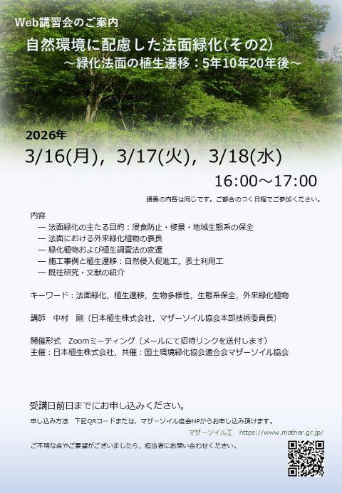 ウェブ講習会「自然環境に配慮した法面緑化(その2)緑化法面の植生遷移:5年10年20年後」を下記のとおり開催いたします。